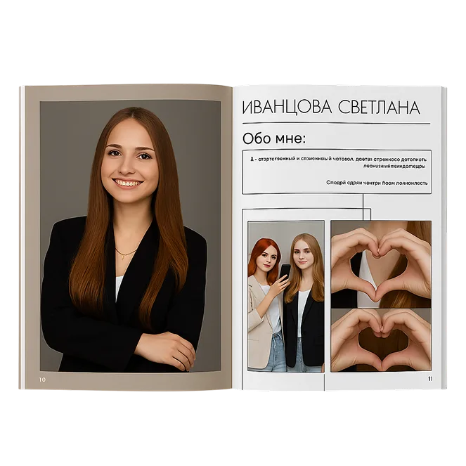 Наши клиенты могут выбирать из 9 стильных вариантов оформления выпускных альбомов: «Премиум», «Персона», «Статус», «Тренд» и другие современные дизайны. Все макеты включают индивидуальные портреты выпускников, виньетки с одноклассниками, репортажные фото со школьных будней и снимок классного руководителя.