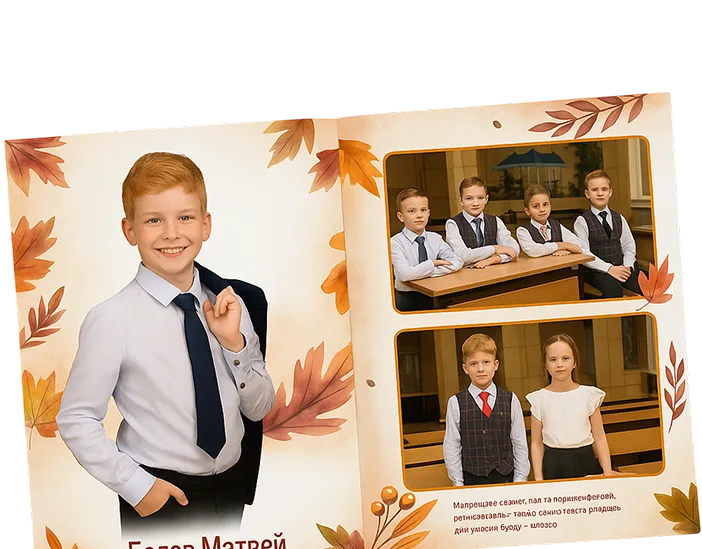 Наши фотографы и дизайнеры работают слаженно, чтобы в каждом развороте ощущалась душа и отражалась память о дружбе, первой школьной любви, мечтах о будущем.